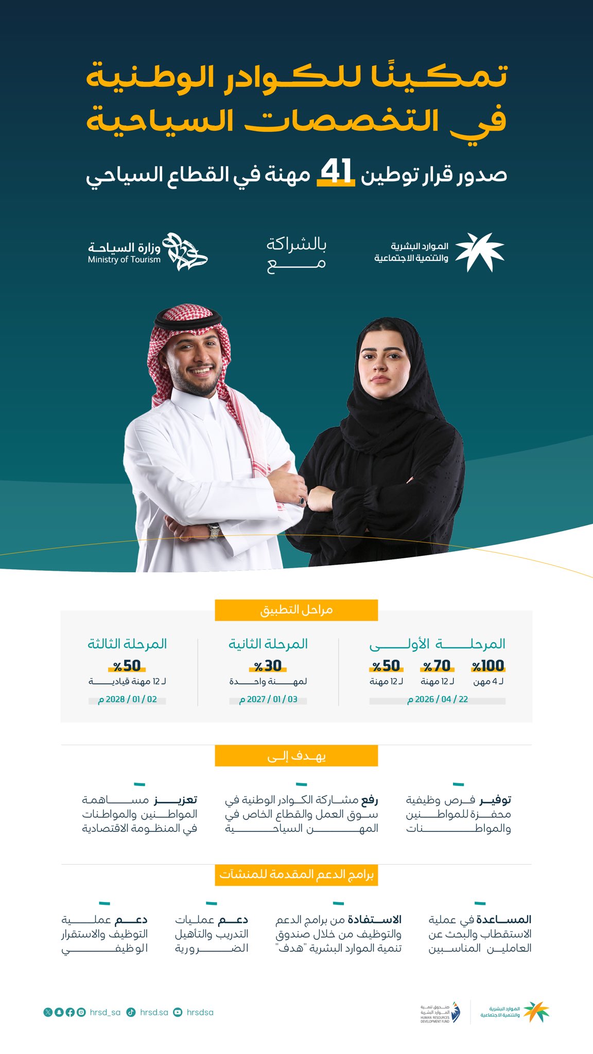 أعلنت وزارة الموارد البشرية والتنمية الاجتماعية وبالشراكة مع وزارة السياحة عن صدور قرار توطين 41 مهنة في القطاع السياحي، وذلك في منشآت القطاع الخاص.