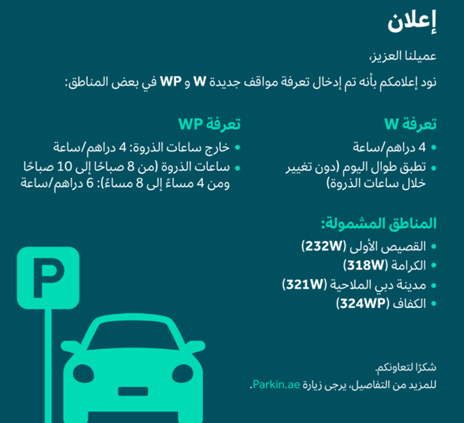 أعلنت شركة باركن، أكبر مـزود لمرافـق وخدمات مواقف المركبـات المدفوعـة في دبي، والمدرجة في سوق دبي المالي، بدء تطبيق تعرفة مواقف جديدة للمركبات في دبي، وذلك في المناطق التي باتت تحمل الرمزين W وWP.