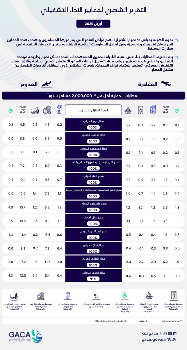 أصدرت الهيئة العامة للطيران المدني اليوم، تقريرها الشهري عن أداء مطارات المملكة الدولية والداخلية، لشهر أبريل 2025م، وفقًا لـ 11 معيارًا أساسيًا لقياس الأداء، تطبيقًا للتوجُّهات الإستراتيجية.