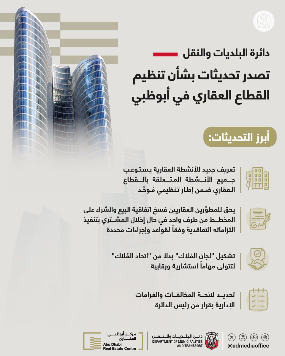 أصدرت دائرة البلديات والنقل تحديثات بشأن تنظيم القطاع العقاري في إمارة أبوظبي، ما يسهم في تعزيز مكانة الإمارة كمركز عالمي للاستثمار العقاري.