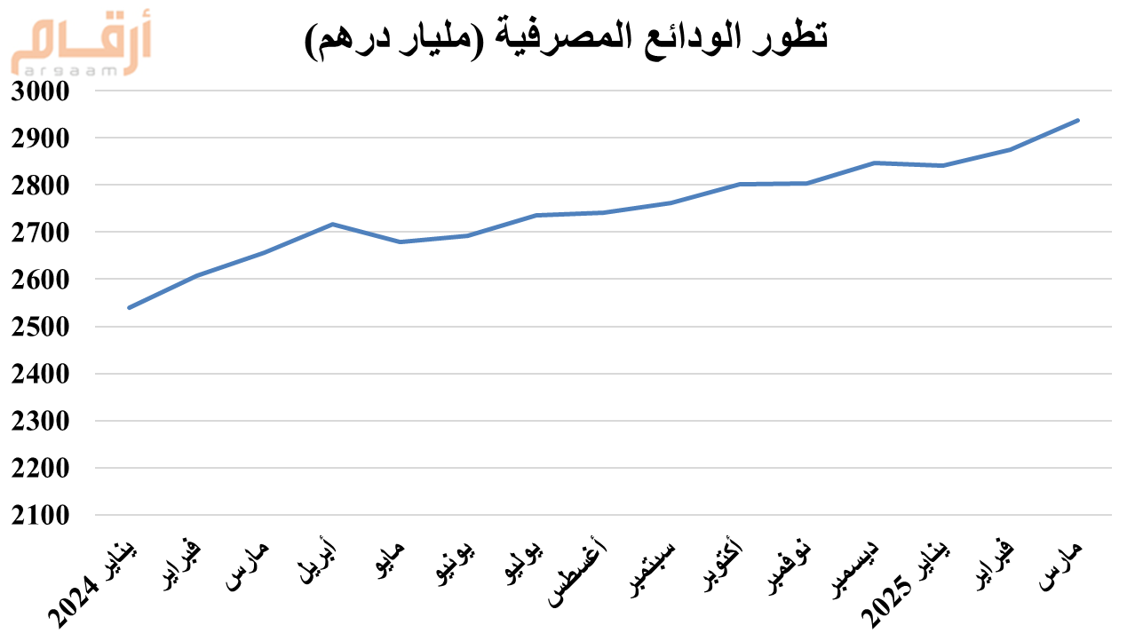 ويرجع الارتفاع في إجمالي الودائع المصرفية إلى الارتفاع في ودائع المقيمين بنسبة 2.4% لتصل إلى 2687.8 مليار درهم وفي ودائع غير المقيمين بنسبة 0.4%، لتصل إلى 248.6 مليار درهم.