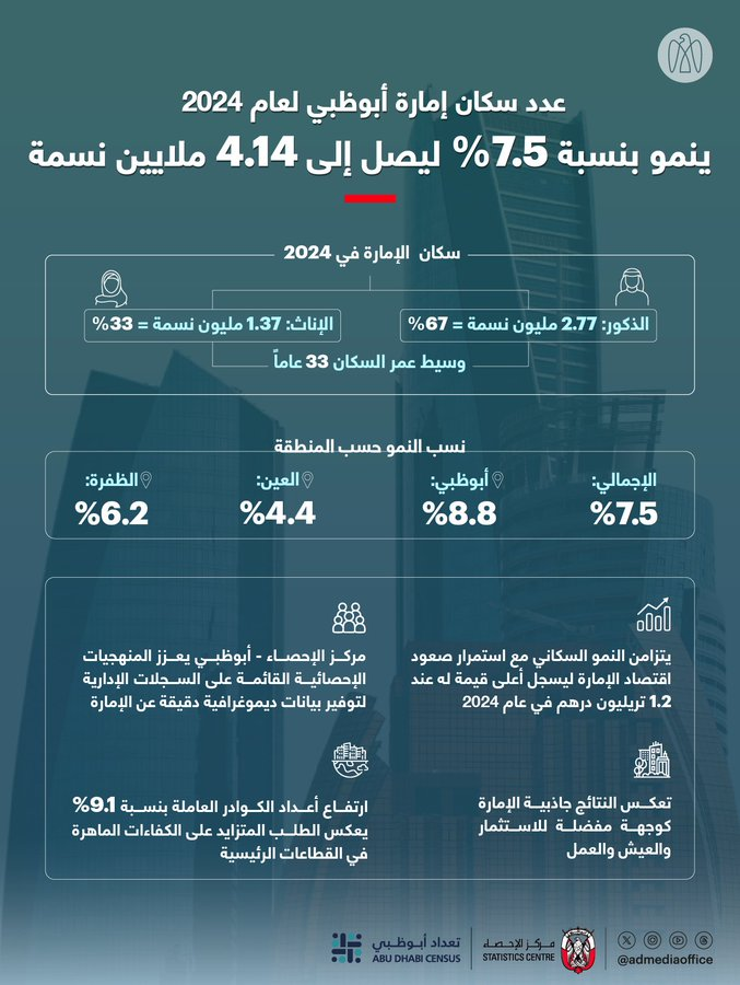كشفت إحصاءات جديدة صادرة عن مركز الإحصاء - أبوظبي، عن نمو عدد سكان إمارة أبوظبي بنسبة 7.5% خلال عام 2024، ليصل إلى 4.14 مليون نسمة بنهاية عام 2024.
