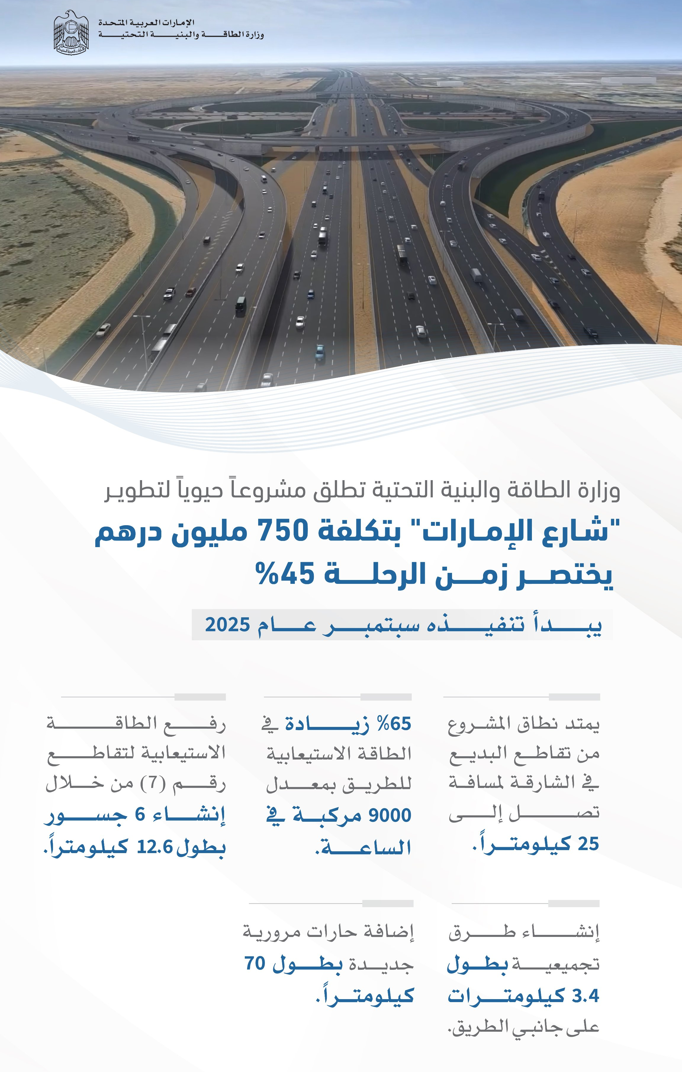 أعلنت وزارة الطاقة والبنية التحتية إطلاق مشروع حيوي لتطوير “شارع الإمارات”، بتكلفة 750 مليون درهم.