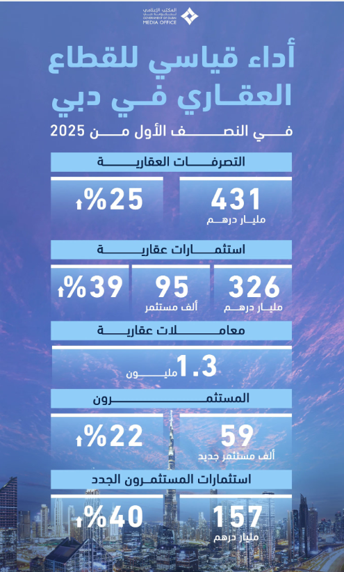 دبي: 157 مليار درهم قيمة استثمارات 59 ألف مستثمر جديد في السوق العقاري خلال النصف الأول 2025