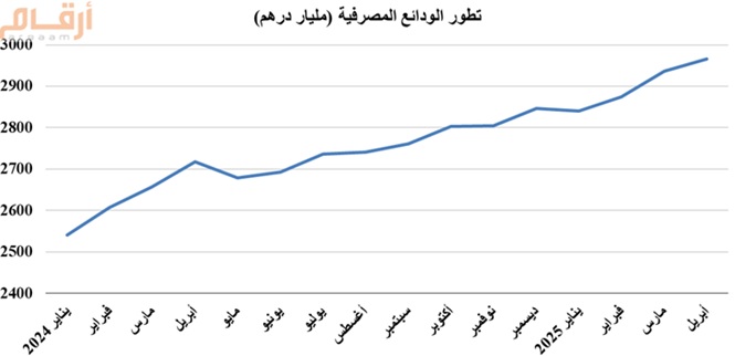 ووفقا لأحدث إحصاءات مصرف الإمارات المركزي، ارتفعت الودائع المصرفية إلى 2965.4 مليار درهم بنهاية أبريل 2025، وبـنسبة 9% مقارنة بنفس الفترة من عام 2024، وارتفعت بقيمة 29 مليار درهم مقارنة بشهر مارس الماضي.