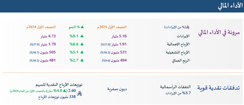 خلال النصف الأول من العام 2025م، سجلت الشركة نمواً في الإيرادات بنسبة 9.1% على أساس سنوي لتصل إلى 5,163 مليون ريال سعودي، مقارنةً بـ 4,730 مليون ريال سعودي في الفترة نفسها من العام السابق.