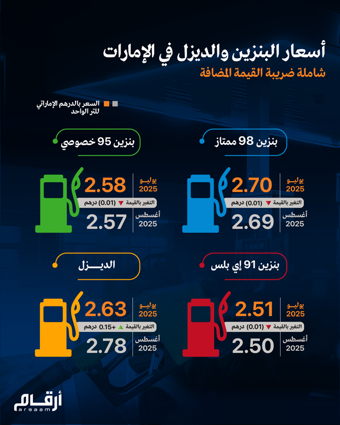 أقرت شركات توزيع البترول بالإمارات، أسعار البنزين بأنواعه والديزل لشهر أغسطس شاملاً ضريبة القيمة المضافة (5%)، ويبدأ تطبيق الأسعار اعتبارا من 1 أغسطس 2025.