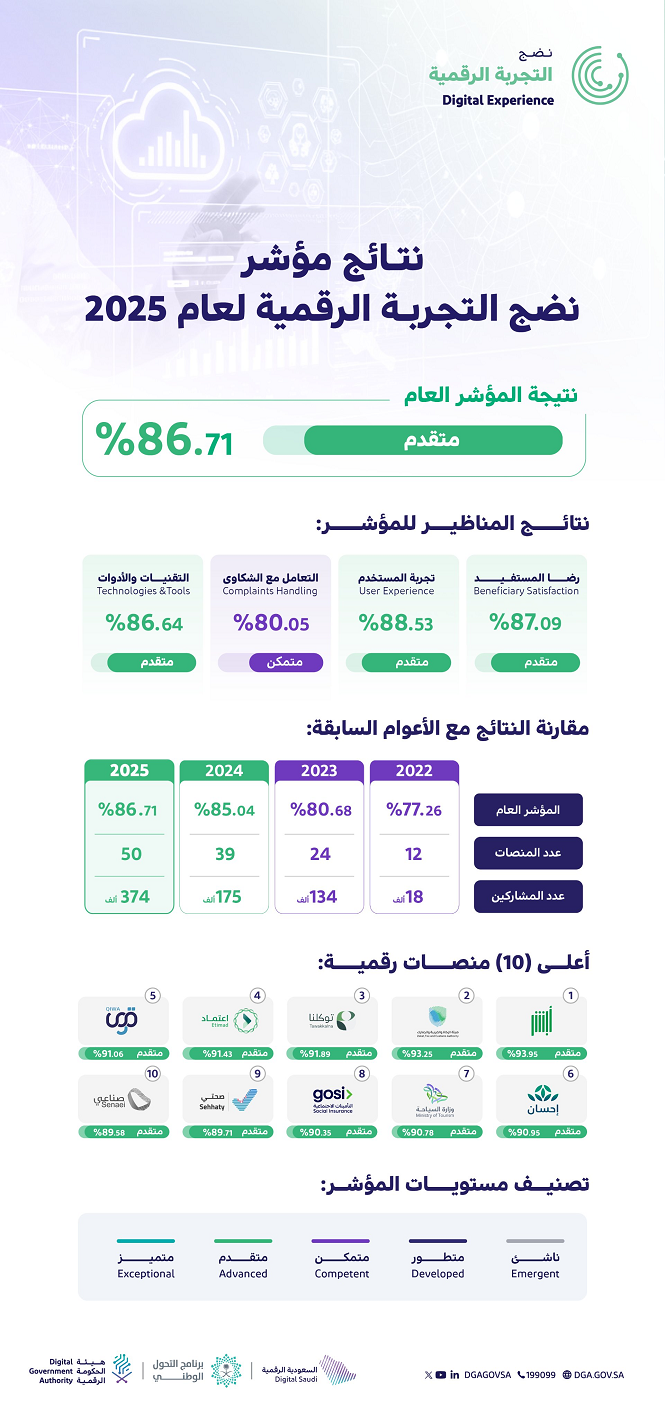 أعلنت هيئة الحكومة الرقمية نتائج مؤشر نضج التجربة الرقمية لعام 2025، حيث بلغ المؤشر نسبة 86.71% بمستوى "متقدم".