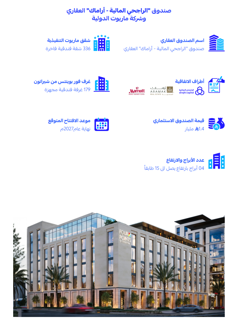 أعلن صندوق "أراماك - الراجحي المالية" العقاري عن توقيع اتفاقية مع شركة ماريوت الدولية للفنادق والضيافة، لافتتاح فندقين ضمن المرحلة الأولى من مشروع أراماك المتكامل شمال الرياض تحت علامتي "شقق ماريوت التنفيذية" للإقامة الطويلة و"فور بوينتس باي شيراتون".