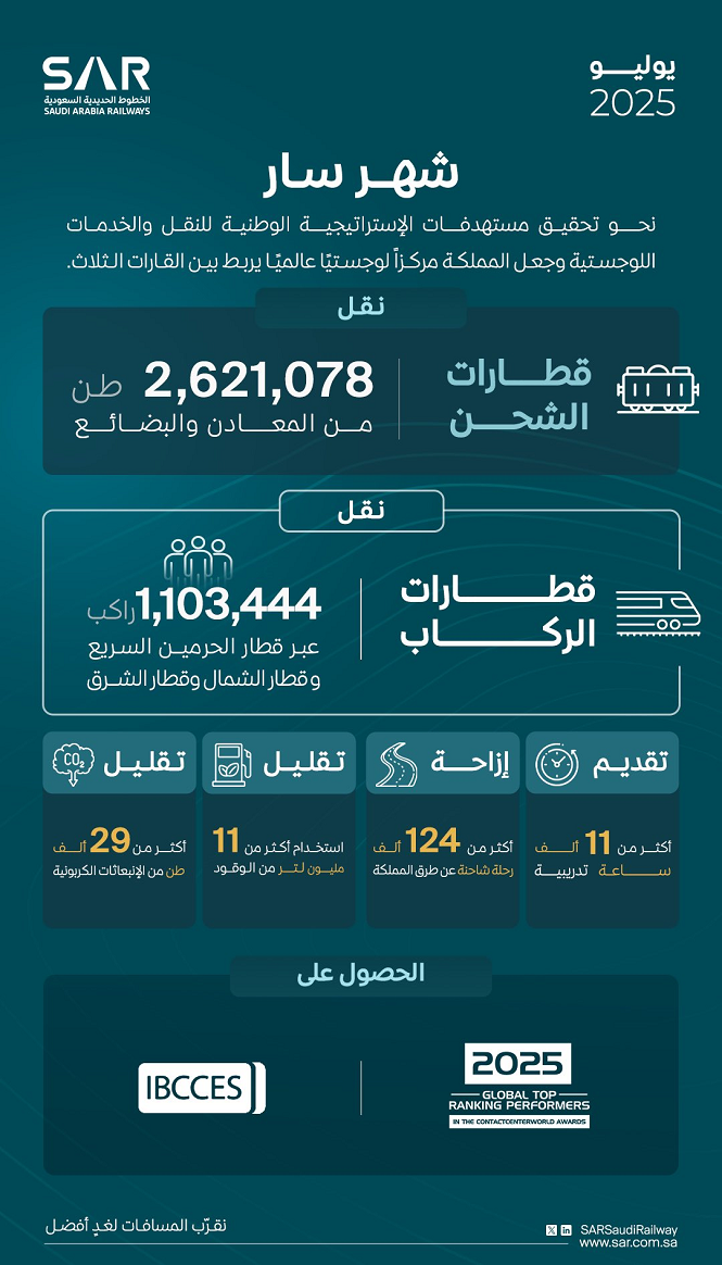 نقلت الخطوط الحديدية السعودية - سار خلال شهر يوليو 2025 أكثر من 2.62 مليون طن من المعادن والبضائع عبر قطارات الشحن، إضافة إلى نقل أكثر من 1.10 مليون راكب عبر قطار الحرمين السريع وقطار الشمال وقطار الشرق.