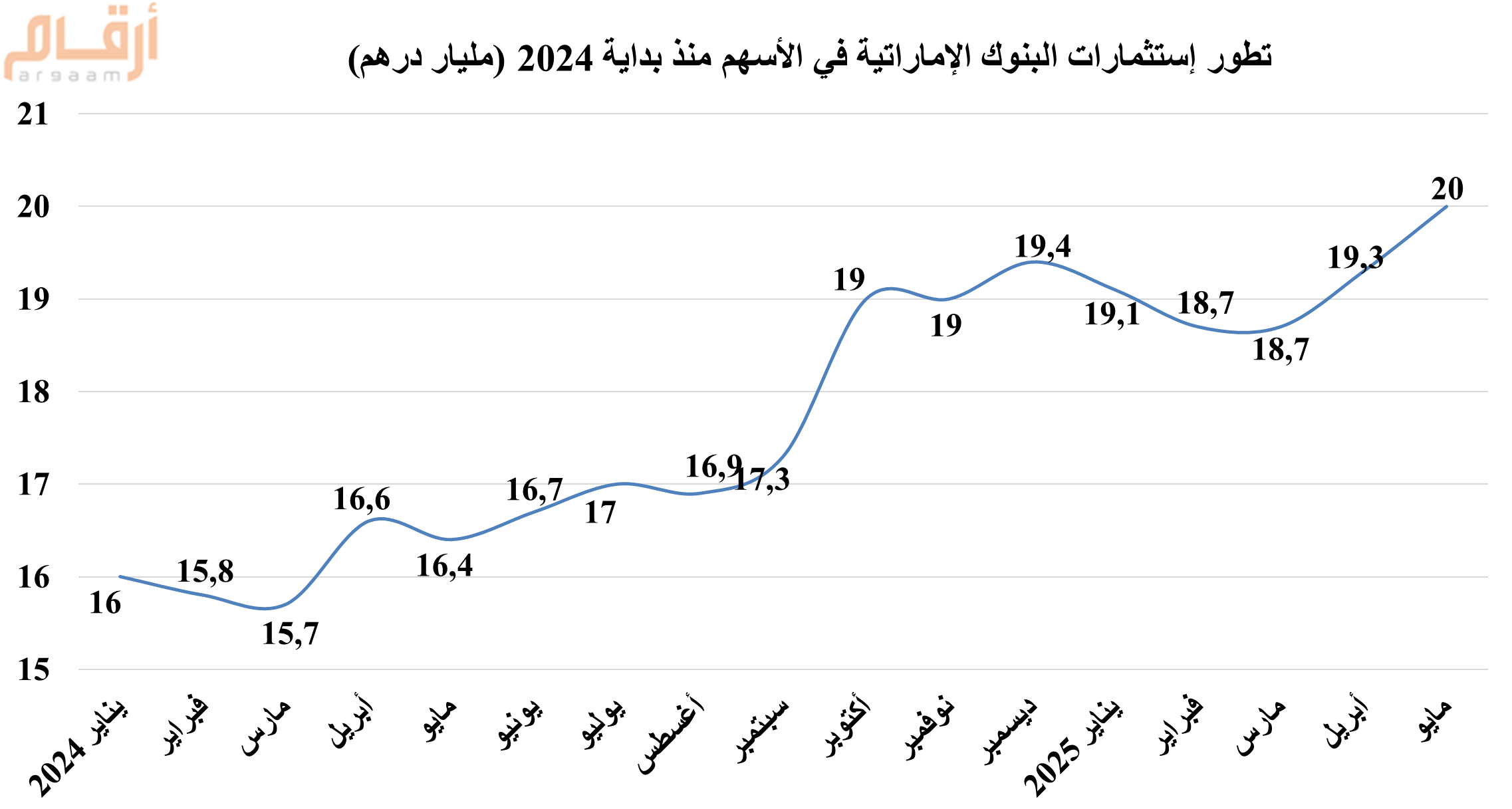وارتفعت استثمارات البنوك في الأسهم في شهر مايو الماضي بنسبة 3.6% لتصل إلى 20 مليار درهم، وبزيادة تعادل 700 مليون درهم مقارنة بشهر أبريل.