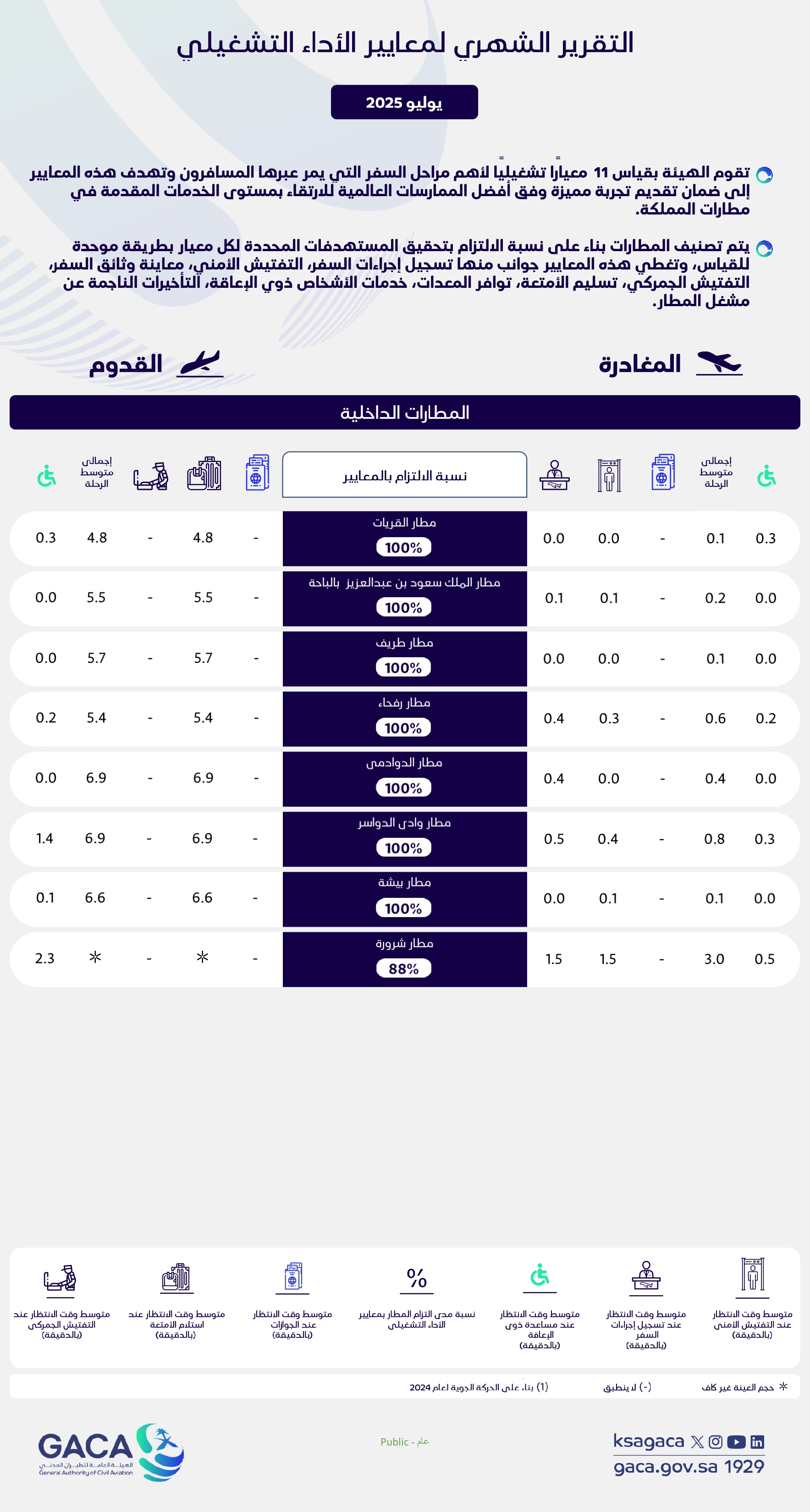 أصدرت الهيئة العامة للطيران المدني اليوم، تقريرها الشهري عن أداء مطارات المملكة الدولية والداخلية، لشهر يوليو 2025.