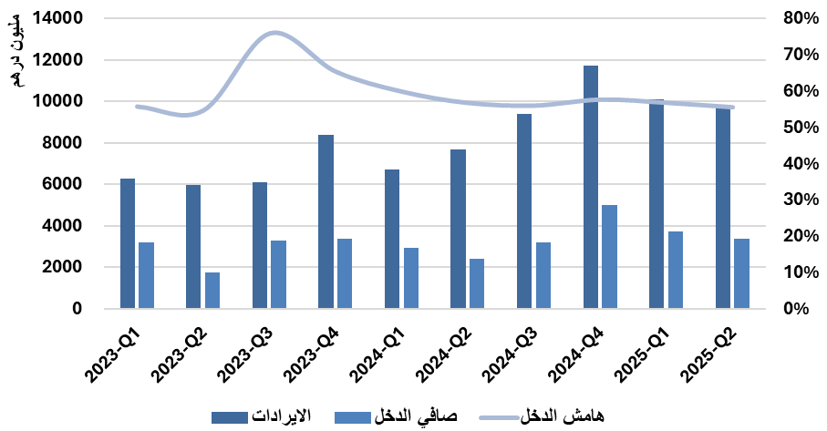 أما على صعيد القطاعات الجغرافية: فقد حققت الإيرادات المحلية مستوى قياسياً بعدما ارتفعت بنحو 32% لتصل إلى 9.22 مليار درهم خلال الربع الثاني 2025 مقابل 6.98 مليار درهم خلال نفس الفترة من العام 2024، إلا أنها انخفضت بنحو 2% عن الربع السابق.
