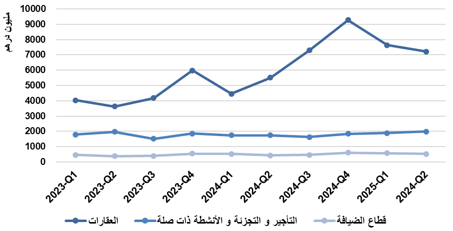 ورغم ارتفاع الإيرادات إلا أن هوامش ربحية القطاع انخفضت بمقدار 1% عن الربع المقارن لتصل إلى 48% خلال الربع الثاني 2025، مقابل 49% خلال الربع المماثل، نتيجة ارتفاع التكاليف المباشرة للقطاع بنسبة أكبر من ارتفاع الإيرادات، كما يوضح الجدول التالي: