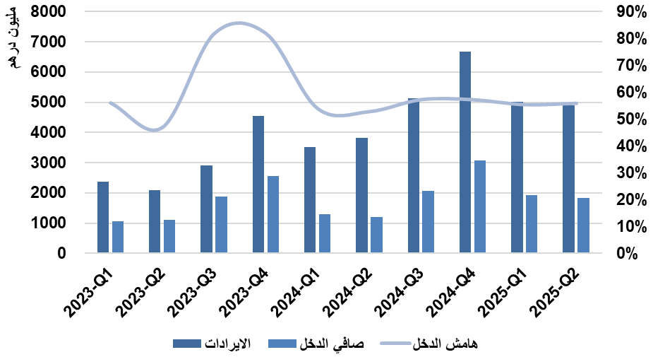 فيما تراجعت تكاليف التمويل بنسبة 69% لتبلغ 46.3 مليون درهم خلال الربع الثاني 2025، قياساً بـ 150.3 مليون درهم خلال نفس الفترة من العام السابق.