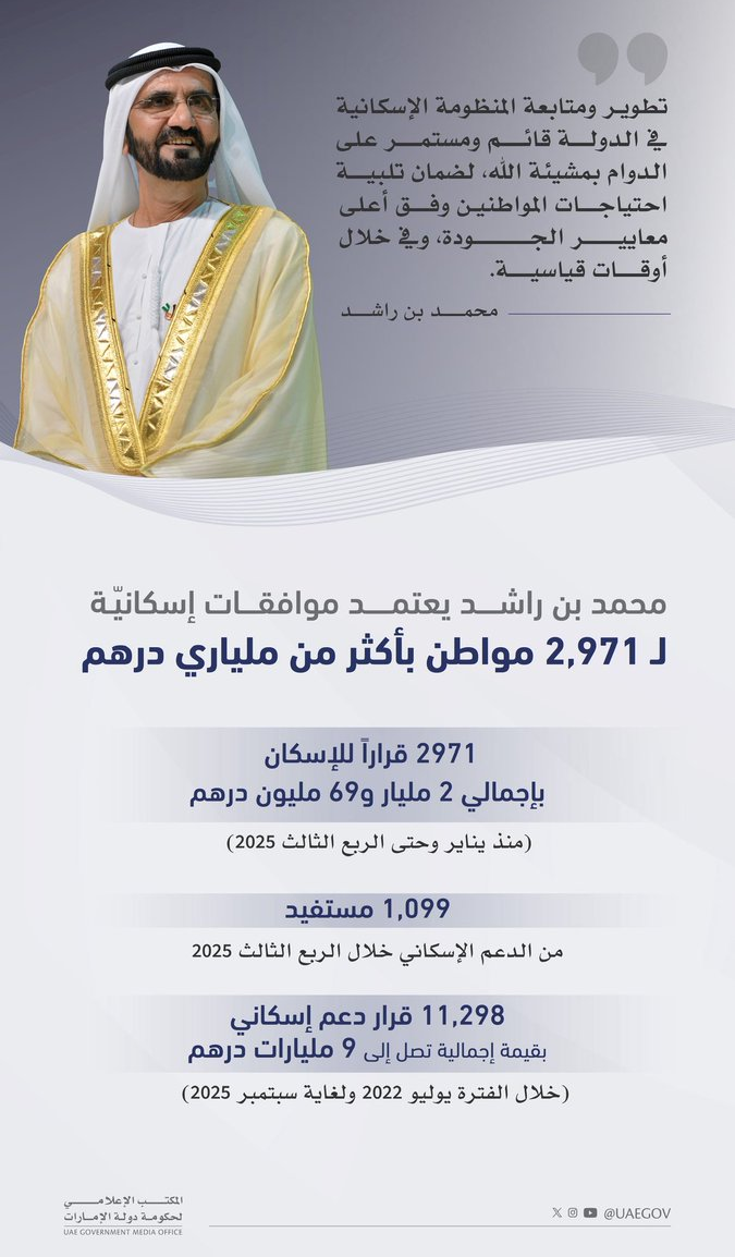 يُذكر أن عدد القرارات الصادرة من برنامج زايد للإسكان منذ يوليو 2022 حتى سبتمبر 2025 وصلت إلى 11 ألفاً و298 قراراً، بقيمة إجمالية تصل إلى ما يقارب 9 مليارات درهم.