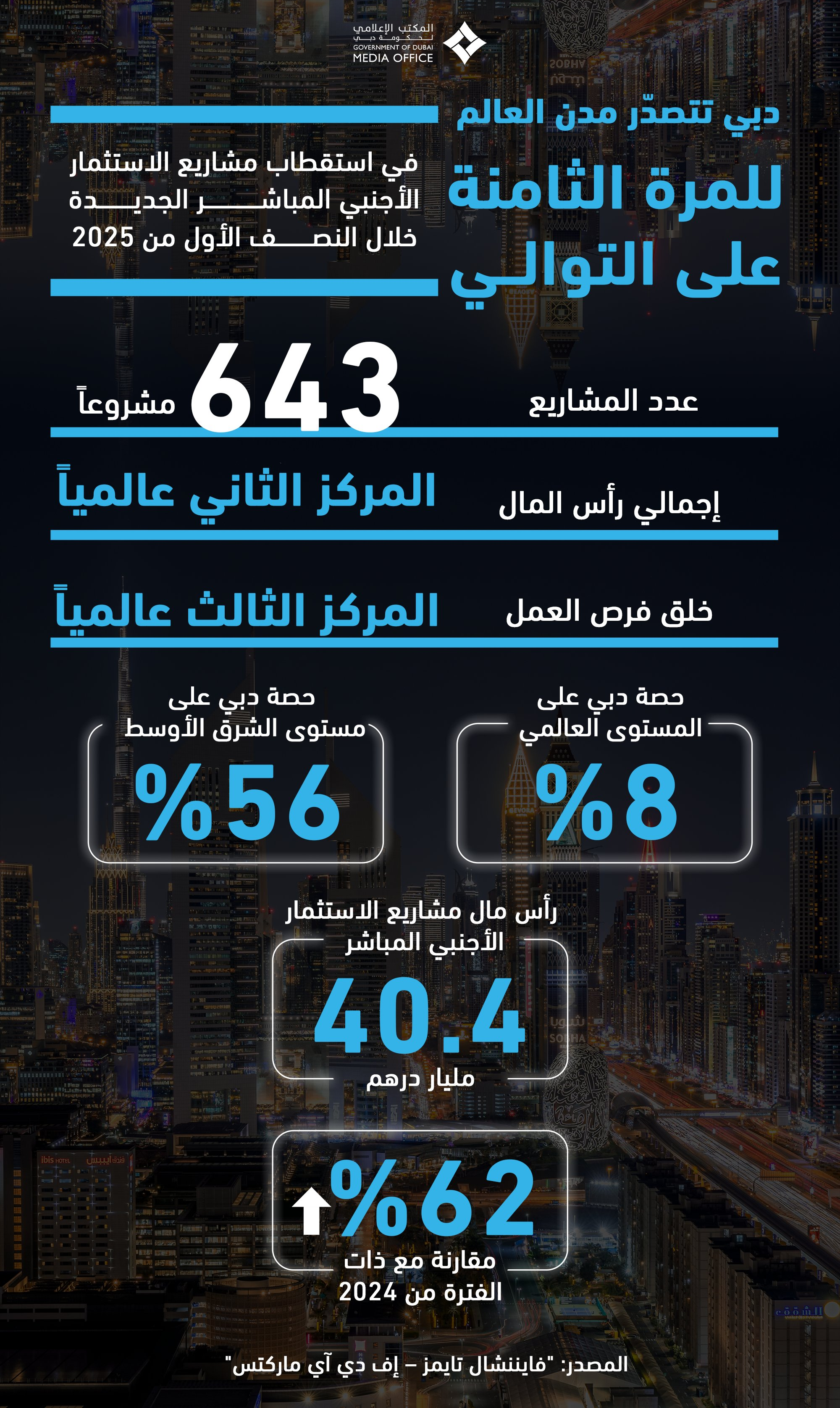 ووفقاً لبيانات مرصد دبي للاستثمار الأجنبي الصادرة عن دائرة الاقتصاد والسياحة بدبي، فقد بلغ رأس مال مشاريع الاستثمار الأجنبي المباشر الذي استقطبته الإمارة حوالي 40.4 مليار درهم خلال النصف الأول من العام 2025، في زيادة بنسبة 62% بالمقارنة مع 24.7 مليار درهم في النصف الأول من العام 2024.