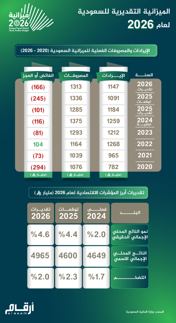 ويتوقـع أن تسـجل ميزانيـة العـام 2026م عجـزًا بنحـو 3.3 % مـن الناتـج المحلـي الإجمالي، مـع توقـع اسـتمرار تسـجيل عجـز فـي الميزانيـة عنـد مسـتويات أقل علـى المـدى المتوسـط، نتيجــة استمرار تبنّــي الحكومــة لسياســات الإنفاق التوســعي الاستراتيجي بهدف استمرار تنفيذ المشاريع والبرامج والمبادرات ذات العائد الاقتصادي والاجتماعي.
