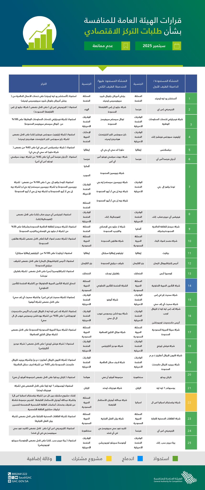 أصدرت الهيئة العامة للمنافسة 25 قراراً بخصوص طلبات التركيز الاقتصادي الواردة إليها خلال شهر سبتمبر 2025.