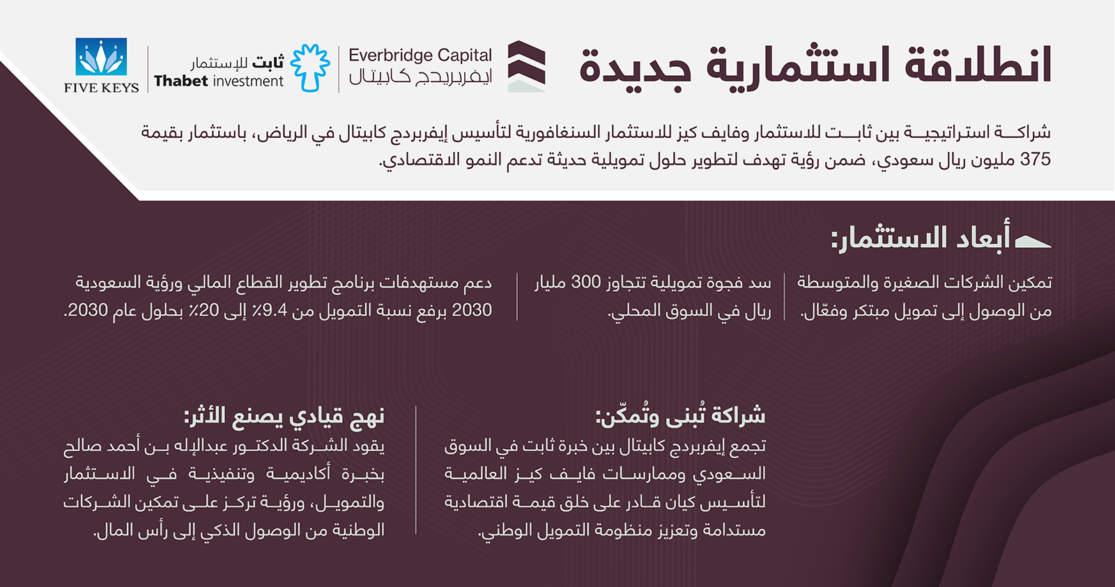 ثابت للاستثمار وفايف كيز السنغافورية تطلقان إيفربردج كابيتال باستثمار 375 مليون ريال