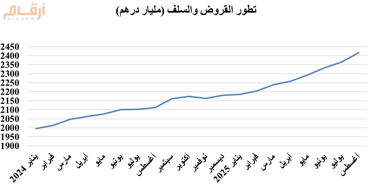 وارتفع إجمالي الائتمان إلى 2417.3 مليار درهم في نهاية شهر أغسطس 2025، ويعزى ذلك إلى الزيادة في الائتمان المحلي بقيمة 36.4 مليار درهم، والزيادة في الائتمان الأجنبي بقيمة 14.7 مليار درهم.