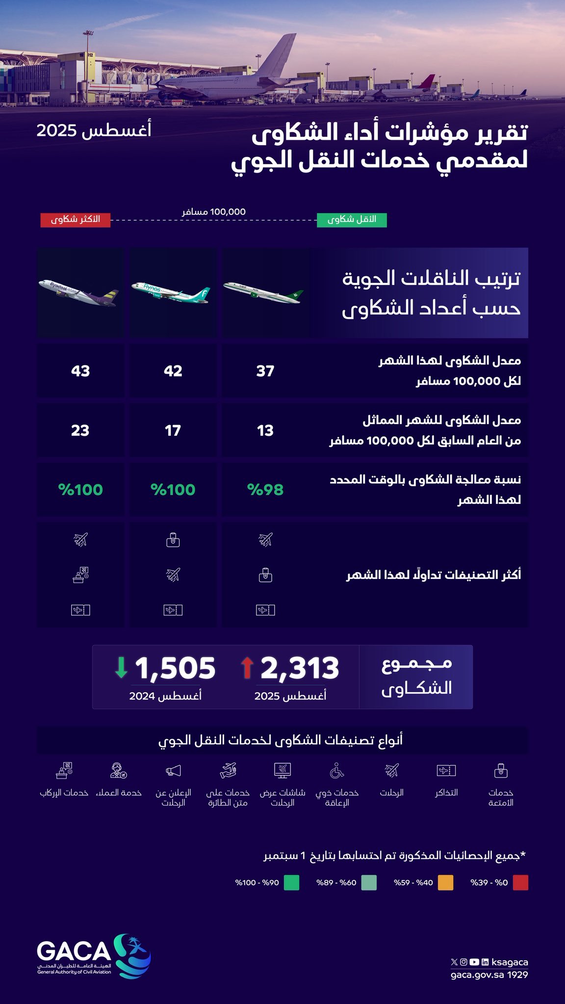 وأوضحت الهيئة عبر حسابها بمنصة إكس، أن عدد شكاوى المسافرين على الناقلات الجوية بلغ 2313 شكوى، مقارنة بـ 1505 شكاوى خلال أغسطس عام 2024.