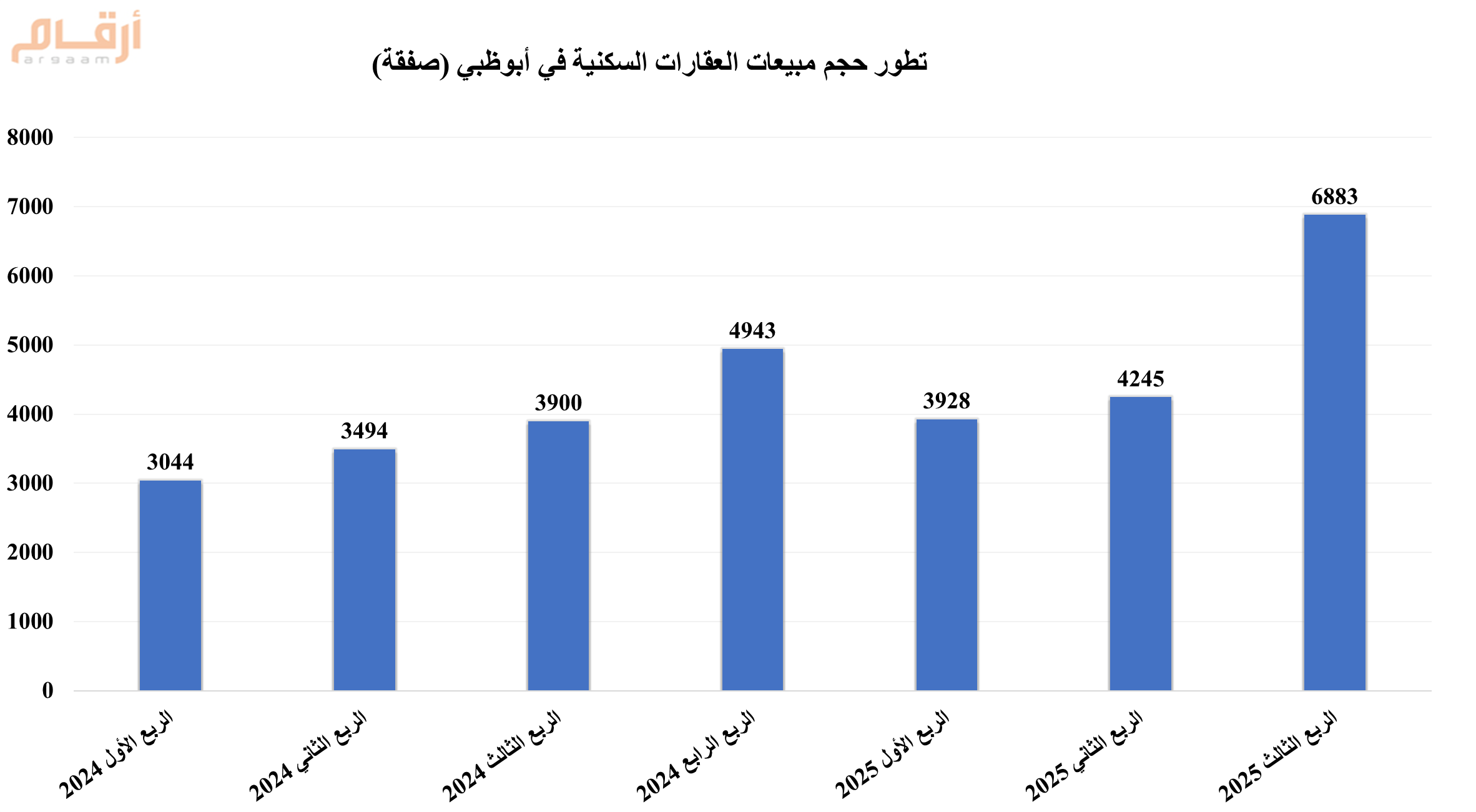 شهد القطاع السكني في إمارة أبوظبي نمواً بواقع 6883 معاملة خلال الربع الثالث 2025، بقيمة إجمالية بلغت 23.3 مليار درهم، مسجلاً ارتفاعاً سنوياً بنسبة 107% من حيث القيمة.