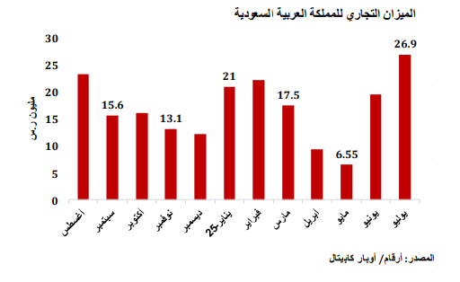 وسجل الميزان التجاري للمملكة العربية السعودية فائضاً قدره 26.85 مليار ريال سعودي خلال يوليو 2025، محققاً نمواً سنوياً بنسبة 53.4% وزيادة قدرها 9.35 مليار ريال مقارنة بنفس الفترة من عام 2024، حين بلغ الفائض 17.5 مليار ريال، وذلك وفقاً لبيانات الهيئة العامة للإحصاء.