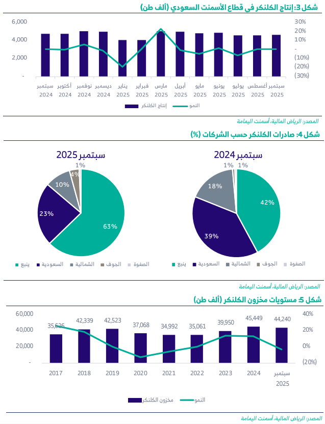 من جهة أخرى، بلغ إنتاج الكلينكر 4.7 مليون طن بارتفاع طفيف سنوي (1%)، وانخفاض شهري (3%). وسجلت أسمنت ينبع أعلى نمو شهري بنسبة 206%، بينما تراجعت أسمنت الجنوبية وأسمنت الشمالية بشكل كبير.