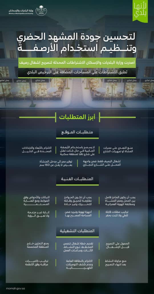 وأوضحت الوزارة في بيان لها، أن الاشتراطات الجديدة تشمل متطلبات الموقع والمتطلبات الفنية والتشغيلية، وتُطبق على المساحات المضافة للترخيص البلدي والمستخدمة لإشغال الأرصفة أمام المحلات التجارية.