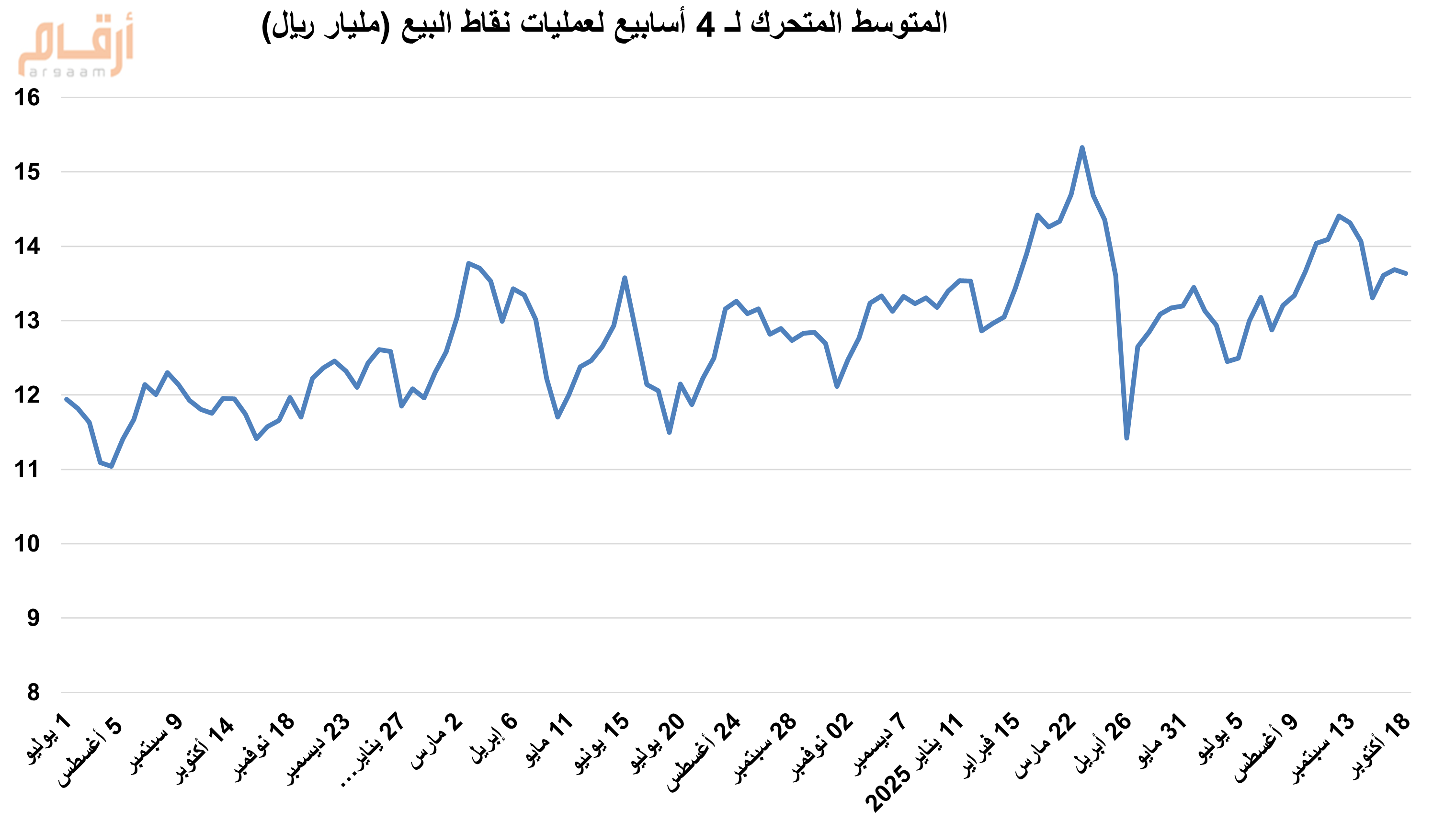 وبلغ المتوسط المتحرك لـ 4 أسابيع نحو 13.6 مليار ريال، وكان قيمة عمليات نقاط البيع قد ارتفعت خلال عام 2024 مقارنة بعامي 2023 و2022، حيث تراوح متوسط قيمة المبيعات بين 11 و14 مليار ريال، فيما كان يتراوح بين 10 و13 مليار ريال في عام 2023 وما بين 9 و12 مليار ريال في عام 2022، كما يوضح الرسم التالي: