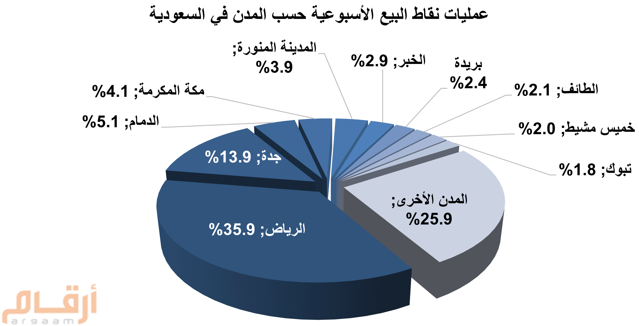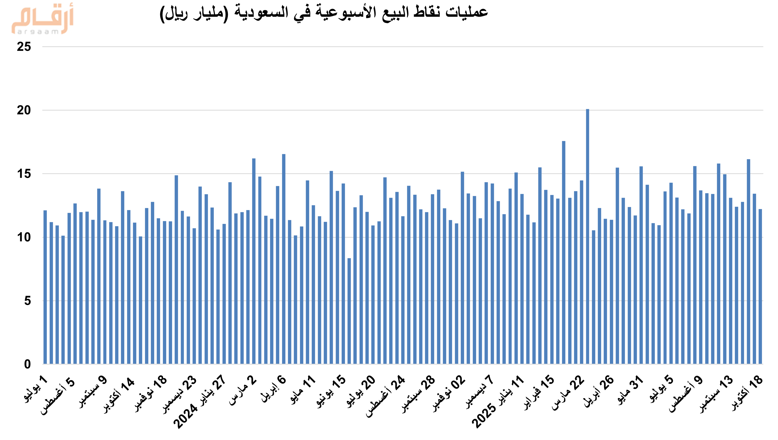 بلغت قيمة المبيعات عبر نقاط البيع في السعودية، نحو 12.2 مليار ريال خلال الأسبوع المنتهي في 18 أكتوبر 2025، مقارنة بنحو 13.4 مليار ريال خلال الأسبوع الذي سبقه.