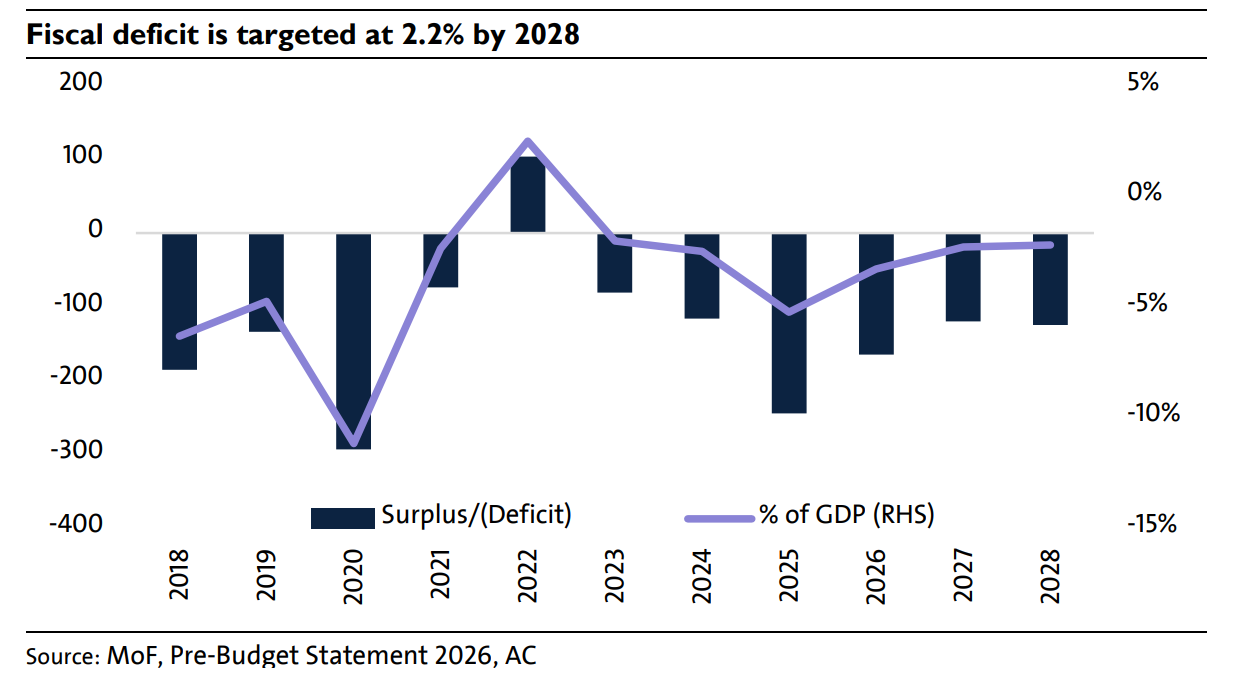 وأوضح التقرير أن السلطات المالية تستهدف خفض العجز المالي إلى 3.3% من الناتج المحلي الإجمالي في عام 2026، مقارنة بعجز متوقع يبلغ 5.3% في 2025، على أن يواصل الانخفاض تدريجياً ليصل إلى 2.2% بحلول عام 2028. ويُعزى ذلك إلى نمو متسارع في الإيرادات بمعدل سنوي مركب يبلغ 6% خلال الفترة 2025-2028، مقابل نمو متحفظ في الإنفاق لا يتجاوز 2% سنوياً.