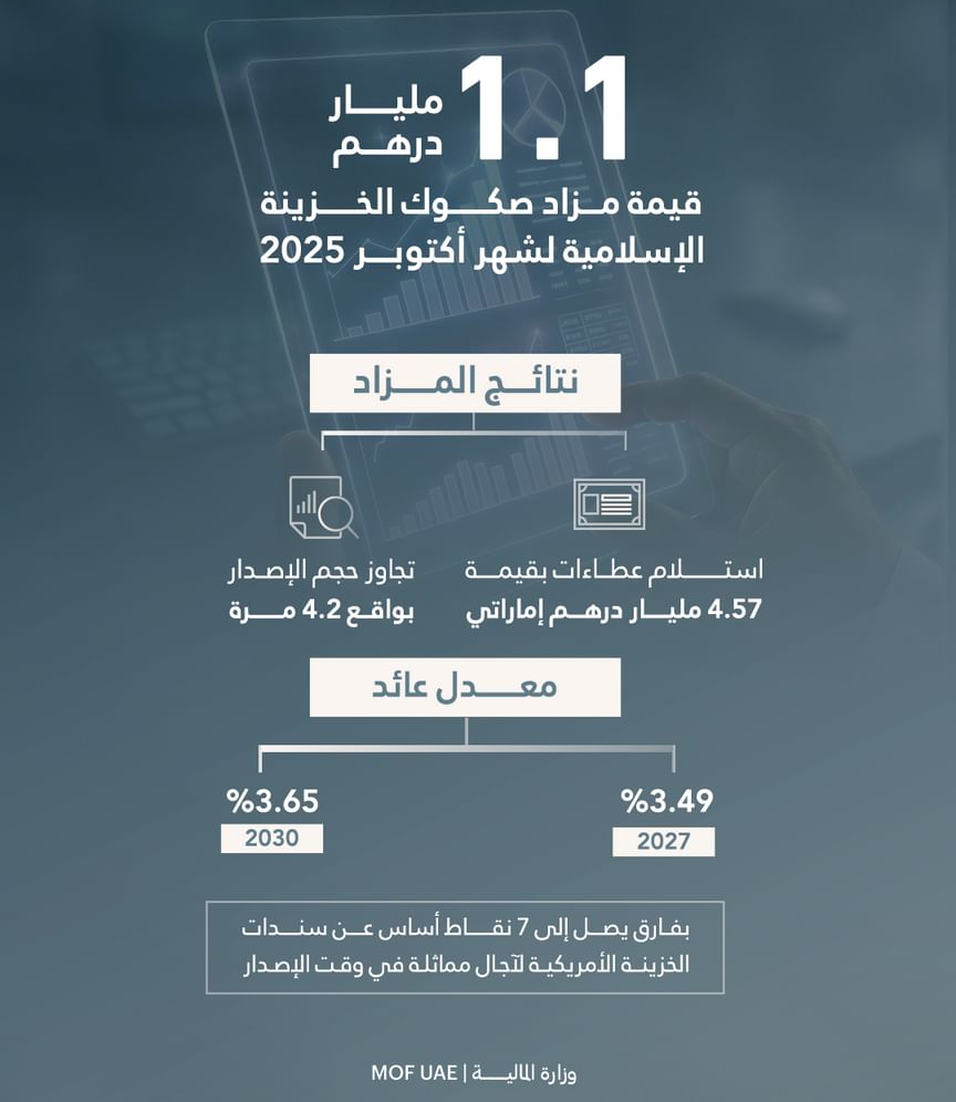 أعلنت وزارة المالية الإماراتية بصفتها الجهة المُصدرة، وبالتعاون مع مصرف الإمارات العربية المتحدة المركزي بصفته وكيل الإصدار والدفع، عن نجاح مزاد صكوك الخزينة الإسلامية "T-Sukuk" المقوّمة بالدرهم الإماراتي، لشهر أكتوبر بقيمة إجمالية بلغت 1.1 مليار درهم، وذلك ضمن برنامج صكوك الخزينة الإسلامية لعام 2025.
