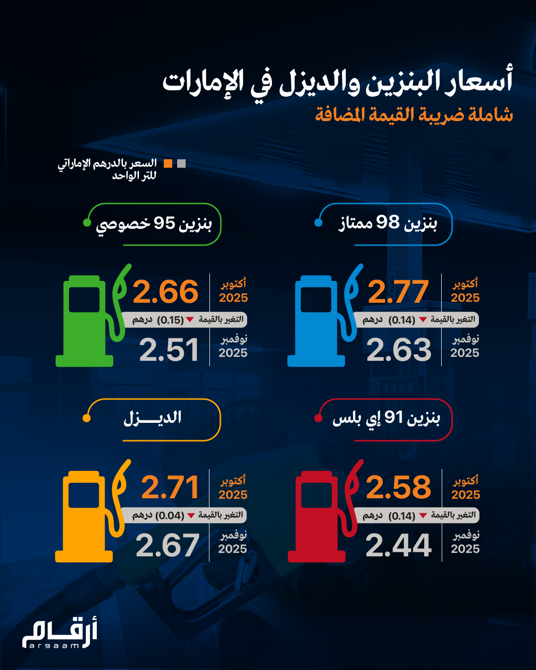 أقرت شركات توزيع البترول بالإمارات، أسعار البنزين بأنواعه والديزل لشهر نوفمبر شاملة ضريبة القيمة المضافة (5%)، ويبدأ تطبيق الأسعار اعتبارا من 1 نوفمبر 2025.