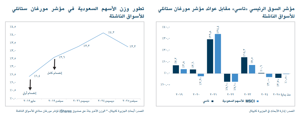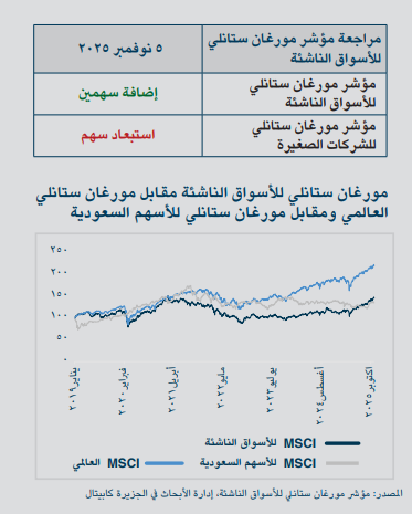 توقعت شركة الجزيرة كابيتال إضافة سهمين إلى مؤشر مورجان ستانلي للأسواق الناشئة القياسي خلال مراجعة 5 نوفمبر 2025.