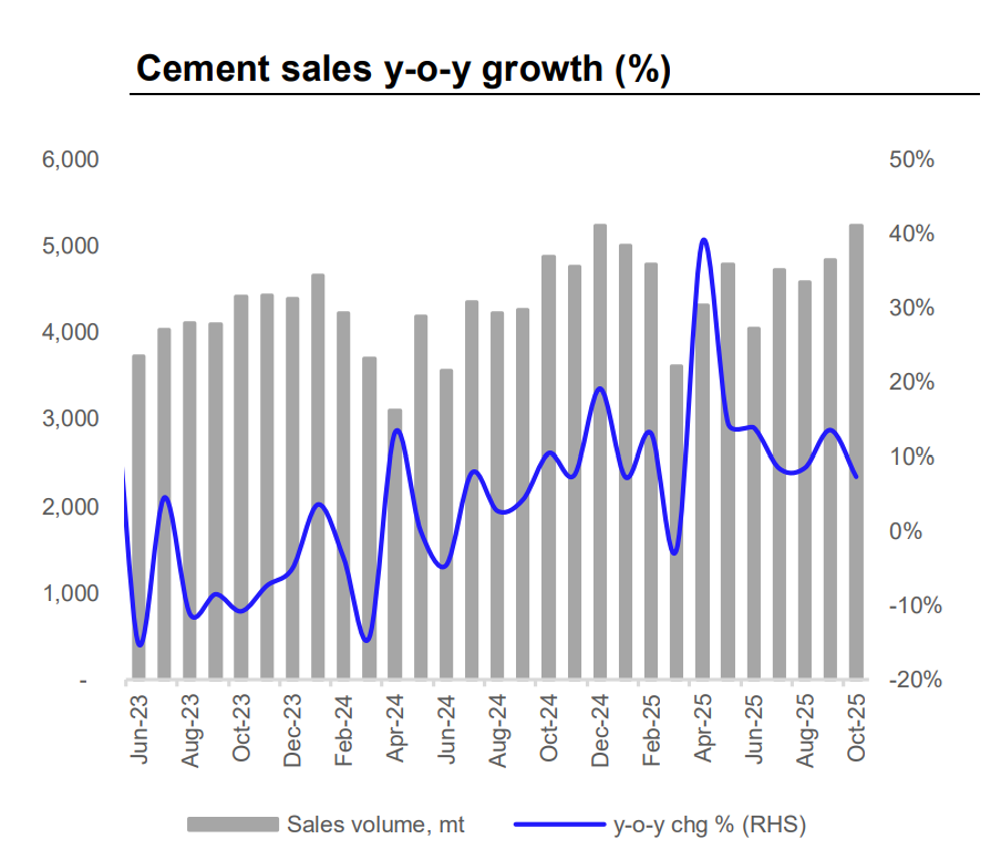 وأوضحت الشركة أن مبيعات الأسمنت ارتفعت بنسبة 7.3% على أساس سنوي، وبنسبة 8.1% على أساس شهري، لتصل إلى 5.24 مليون طن، وهو أعلى مستوى للمبيعات الشهرية منذ مارس 2021.