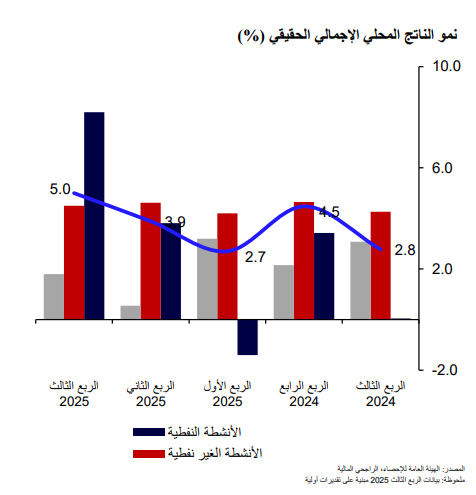 ونما الناتج المحلي الإجمالي الحقيقي للمملكة بنسبة 5.0% على أساس سنوي في الربع الثالث من عام 2025، مدفوعًا بزيادة قدرها 8.2% في نشاط قطاع النفط، في حين ارتفعت الأنشطة غير النفطية بنسبة 4.5%، ونمت الأنشطة الحكومية بنسبة 1.8%، وفقًا للتقديرات الأولية للهيئة العامة للإحصاء.