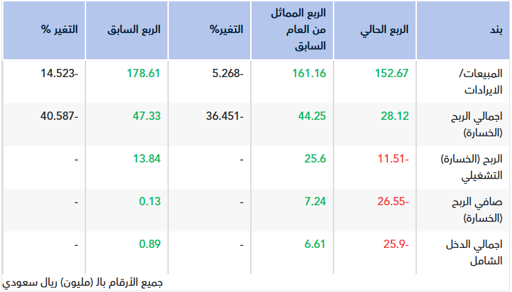 بلغت صافي الخسائر 26.55 مليون ريال مقارنة بصافي ربح 7.24 مليون عن الربع المماثل من العام الماضي بإنخفاض 33.79 مليون ريال ويرجع ذلك بشكل رئيسي إلى انخفاض الإيرادات خلال الربع الحالي في قطاعي الترفيه والفنادق مقارنة بالربع المماثل من العام الماضي . وكذلك انخفاض مجمل الربح من 44.25 مليون ريال الى 28.12 مليون ريال. بالاضافة الى وجود رد مخصصات خسائر ائتمانية خلال الربع المماثل من العام السابق بقيمة 12.44 مليون حيث تم تحصيل المديونيات المرتبطة بتلك المخصصات خلال العام الماضي.