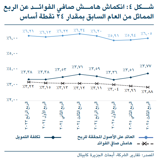 انخفض هامش صافي الفوائد للقطاع خلال الربع الثالث 2025 عن الربع المماثل من العام السابق بمقدار 24 نقطة أساس إلى 2.88%. وتراجع نمو صافي الدخل من العمليات الخاصة بشكل كبير خلال الربع الثالث 2025 حيث انخفض في الربع الثالث 2025 إلى 5.7% مقابل 9.4% في الربع الثاني 2025 و 1.1% في الربع الأول 2025 وذلك عن الربع المماثل من العام السابق.