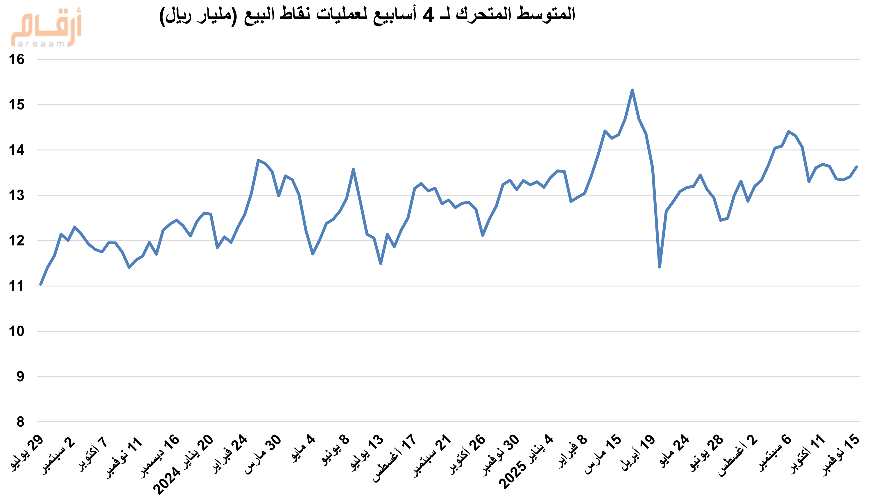 وبلغ المتوسط المتحرك لـ 4 أسابيع نحو 13.6 مليار ريال، وكان قيمة عمليات نقاط البيع قد ارتفعت خلال عام 2024 مقارنة بعامي 2023 و2022، حيث تراوح متوسط قيمة المبيعات بين 11 و14 مليار ريال، فيما كان يتراوح بين 10 و13 مليار ريال في عام 2023 وما بين 9 و12 مليار ريال في عام 2022، كما يوضح الرسم التالي: