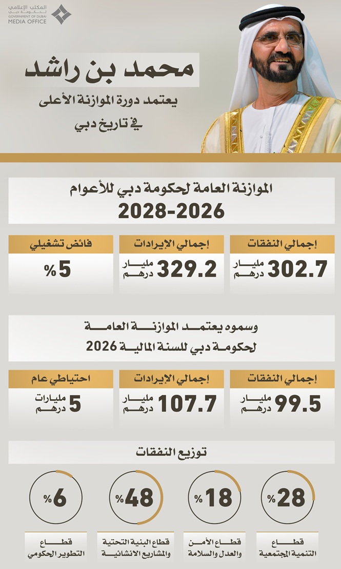 اعتمد الشيخ محمد بن راشد آل مكتوم، نائب رئيس دولة الإمارات، رئيس مجلس الوزراء، حاكم دبي، دورة الموازنة العامة لحكومة دبي للأعوام 2026-2028، هي الأعلى في تاريخ الإمارة بإجمالي نفقات قدره 302.7 مليار درهم.