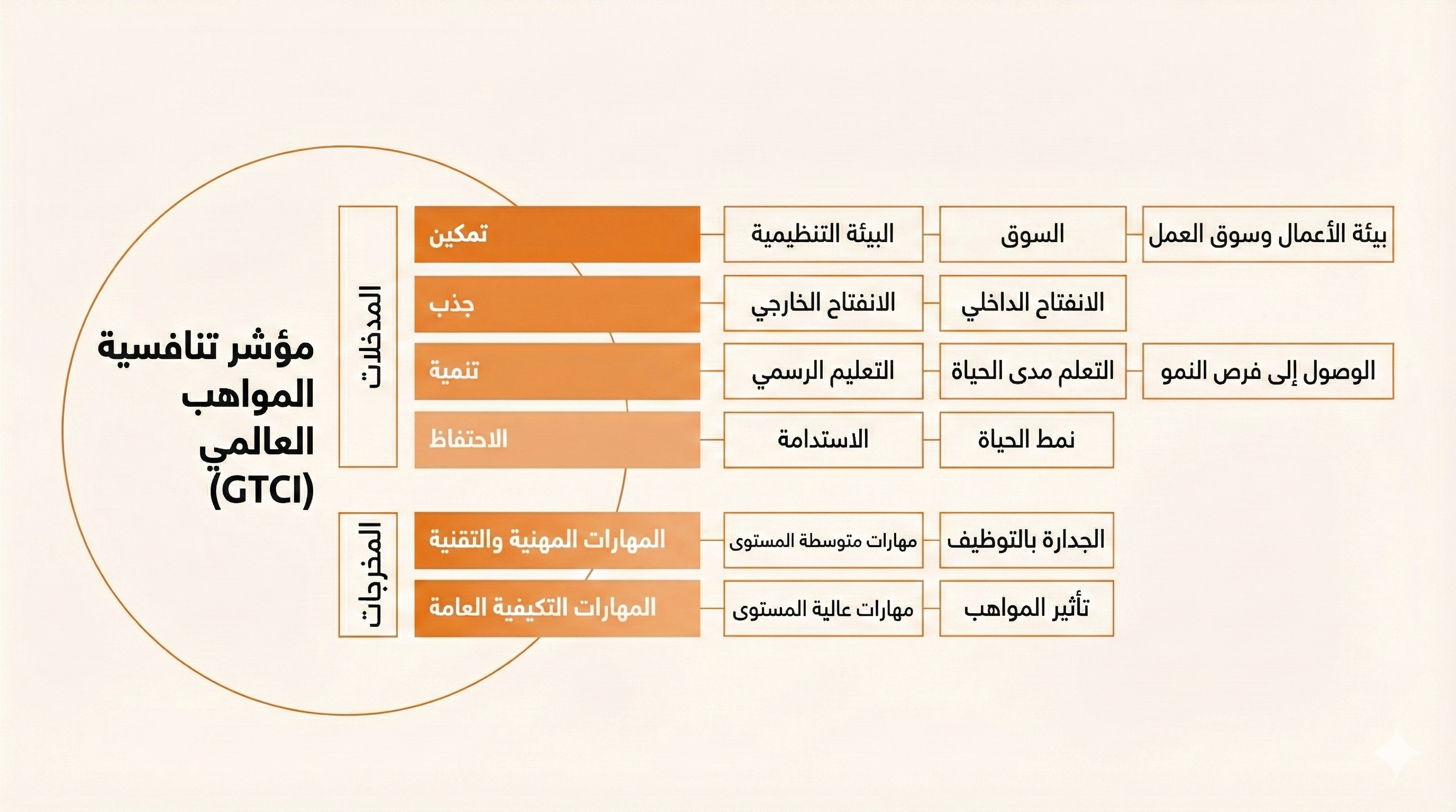 - يقدم المؤشر نموذجًا متكاملاً لقياس تنافسية المواهب عبر 77 مؤشرًا فرعيًا تغطي المؤسسات، التعليم، جودة الحياة، الانفتاح، المهارات الرقمية، والابتكار، ويصنف تقرير هذا العام الذي يحمل عنوان "المرونة في عصر الاضطراب"، ما مجموعه 135 دولة، تمثل مجتمعة أكثر من 97% من الناتج المحلي الإجمالي العالمي و93% من سكان العالم.