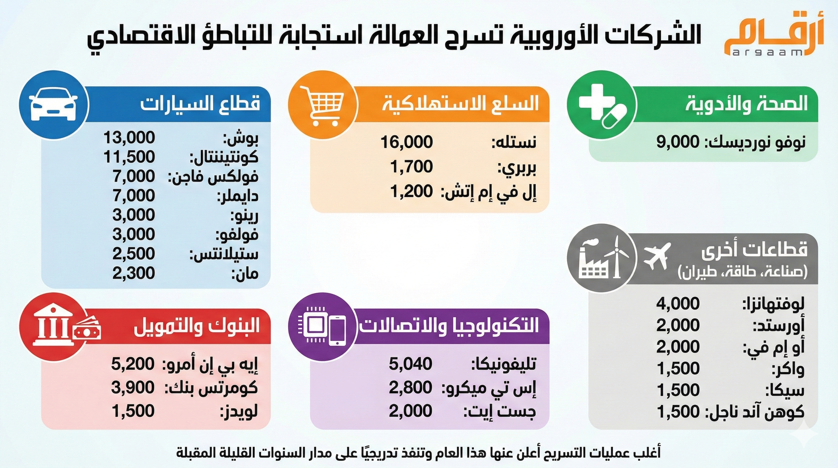 لم يعد الحديث عن "التباطؤ الاقتصادي" في القارة العجوز مجرد تحذيرات تطلقها المؤسسات المالية، بل تحول في عام 2025 إلى واقع مؤلم يُترجم يومياً عبر بيانات تسريح آلاف الموظفين.