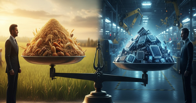 سؤال أيّهما أهمّ إنتاج الرقائق أم إنتاج الطعام؟ لا يملك إجابة واحدة عامة، فمن منظور بقاء الإنسان فالأولوية القصوى هي الأمن الغذائي والتوافر الغذائي العادل.
