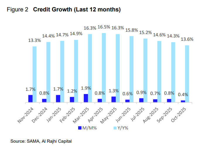 نما الائتمان في القطاع المصرفي السعودي بـ 0.4% في أكتوبر على أساس شهري وبنحو 13.6% على أساس سنوي، مدفوعاً بنمو نمو قروض الشركات 0.6% على أساس شهري، و 19.6% على أساس سنوي، بينما تباطأ نمو القروض الشخصية (بما في ذلك الرهن العقاري) إلى 0.2% على أساس شهري و6.6% على أساس سنوي.