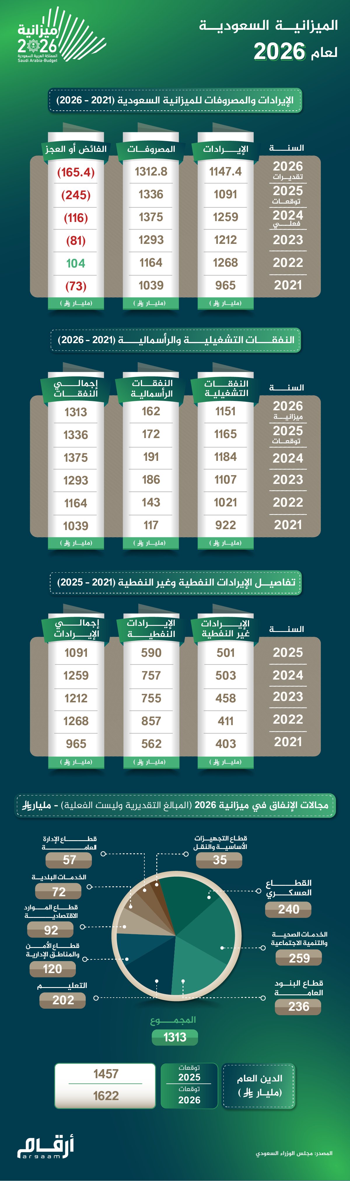 • ميزانية 2026: الإيرادات 1147.4 مليار ريال والمصروفات 1312.8 مليار ريال بعجز 165.4 مليار ريال