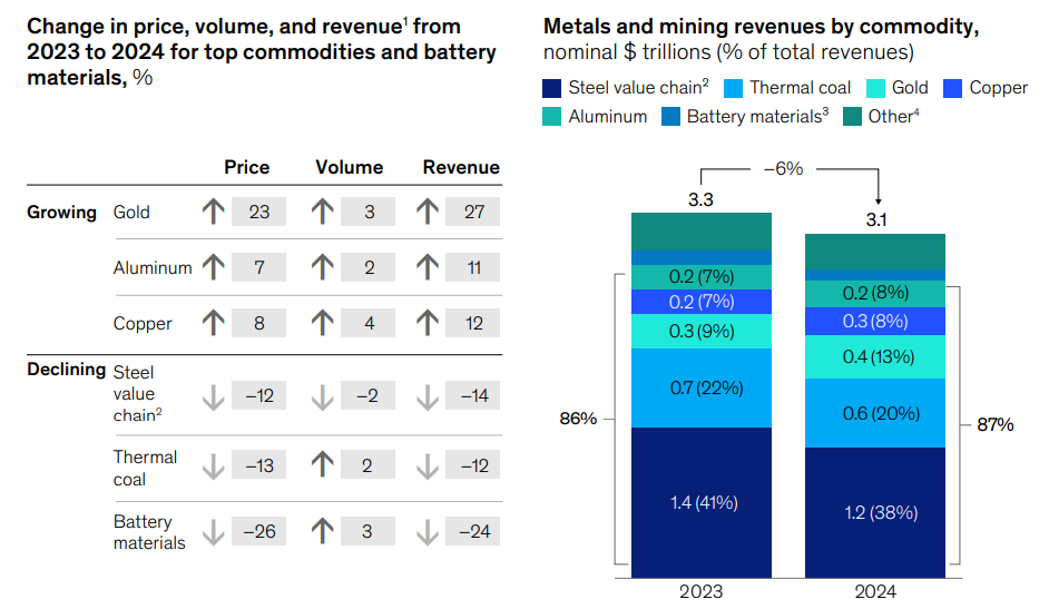في عام 2024، شهدت صناعة المواد انكماشاً إجمالياً بنسبة 2%، حيث تراجعت إيرادات المعادن والتعدين بنسبة 6% لتصل إلى حوالي 3 تريليونات دولار، ويعود هذا الانخفاض بشكل أساسي إلى تصحيحات الأسعار في الفحم الحراري والصلب،. ومع ذلك، ظلت الربحية الإجمالية للصناعة مرنة عند حوالي 1.3 تريليون دولار، مدعومة بقوة الطلب وارتفاع أسعار الذهب والنحاس والألمنيوم.