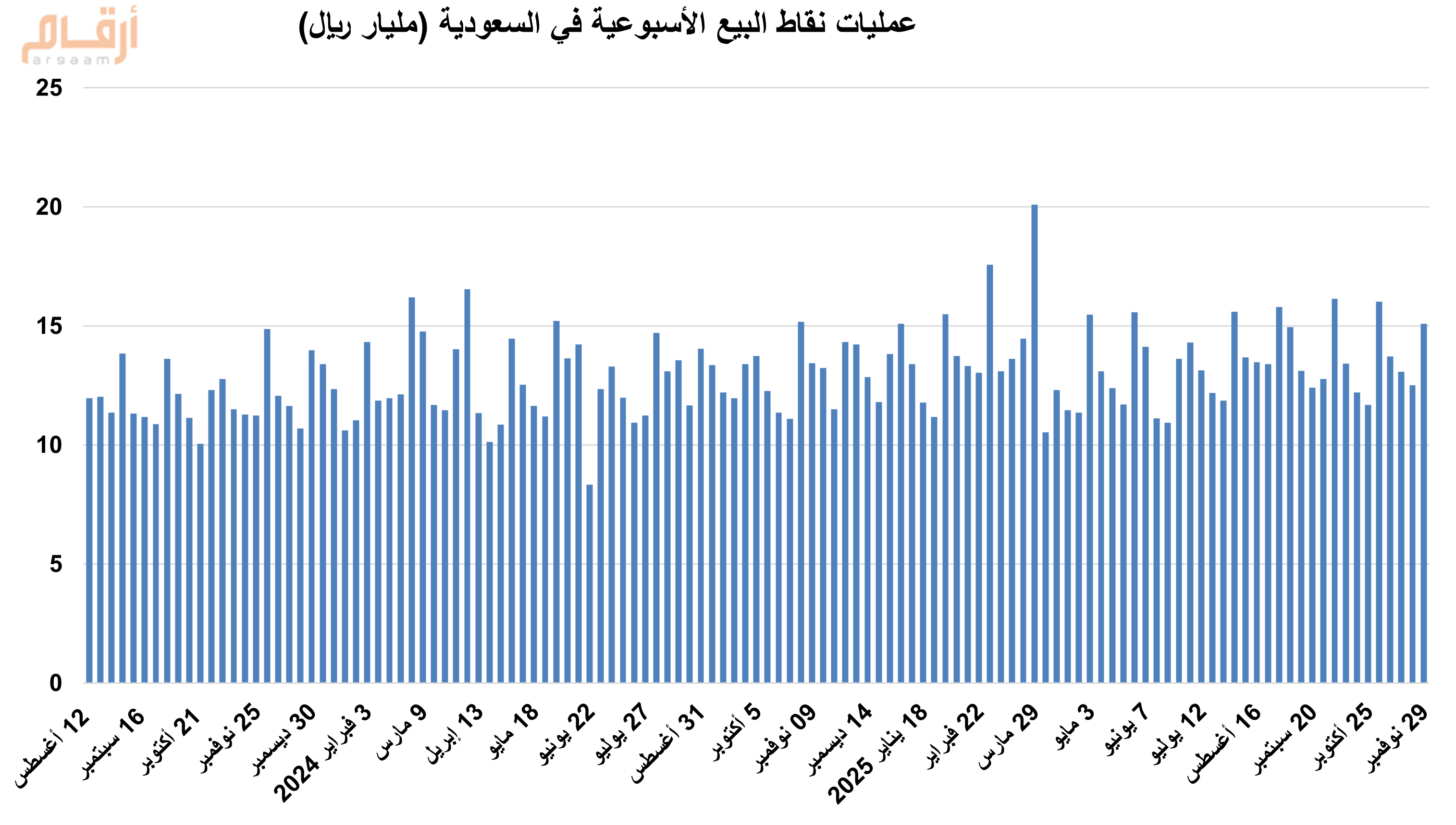بلغت قيمة المبيعات عبر نقاط البيع في السعودية، نحو 15.1 مليار ريال خلال الأسبوع المنتهي في 29 نوفمبر 2025، مقارنة بنحو 12.5 مليار ريال خلال الأسبوع الذي سبقه.