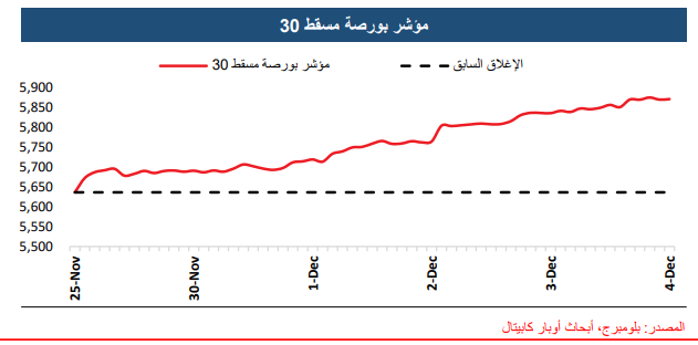 إرتفع مؤشر بورصة مسقط بنسبة 3.99% (224.81 نقطة) خلال الأسبوع المنتهي في 04 ديسمبر 2025، ليغلق عند 5,860.80 نقطة. في المقابل كل المؤشرات صعدت بلا استثناء.